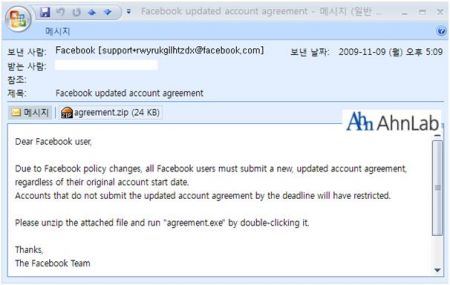 <그림> 페이스북(Facebook)의 계정관리 메일로 위장한 악성코드