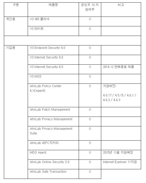 - V3 Internet Security 9.0 및 V3 Endpoint Security 등 기업용 V3제품군도 윈도우 10 환경에서도 사용가능
