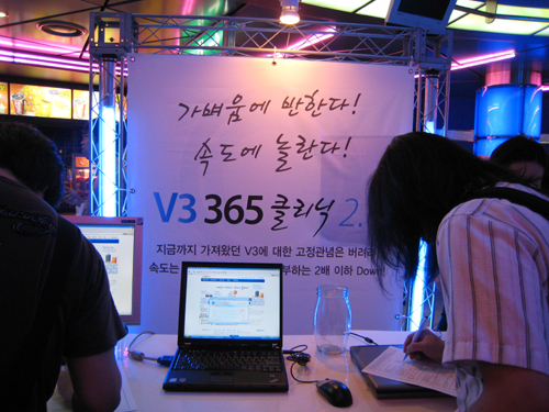 안철수연구소의 부스를 방문한 참석자들 중에는 백신 전문가에 가까울 정도로 전문적인 지식을 가진 참석자도 많았습니다. 외산 제품과 V3의 비교 분석을 비롯하여 일반 유저를 넘어서 보다 적극적인 사용자로 백신 사용에 있어 불편함과 개선 사항을 말씀해 주시기도 했습니다. 특히 기존 제품의 장단점을 나름대로 분석하여 의견을 나누고 부스 담당자에게 개선 사항을 조목 조목 설명해 주신 분들도 있었습니다. 안철수연구소를 찾은 사람들 중에는 10년 이상 V3를 써온 고객들은 반가운 마음에 10년간 V3를 써왔노라 자랑을 하며 앞으로 더욱 더 힘 써달라는 당부도 빼놓지 않았습니다. 또한 이번에 출시된 V3 365 클리닉 2.0에 대해 큰 기대를 가지고 있다는 말도 덧붙였습니다.