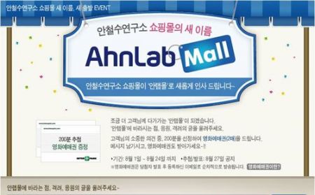 안철수연구소 쇼핑몰의 이름이 '안랩몰'로 새출발합니다. 안랩몰에 바라는 사항이나 격려, 응원의 메시지를 올려주세요. 200명을 선정하여 영화예매권 2장을 선물로 드립니다.