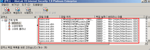 이 경우, V3 검역소 진단로그에 lsass.exe 파일 진단내역이 존재합니다.