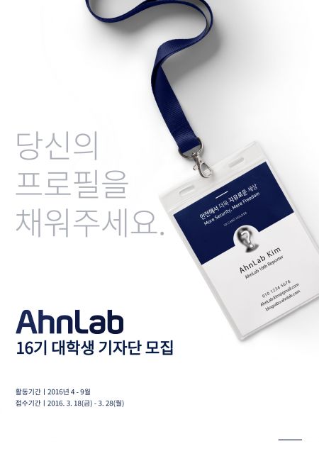 안랩(대표 권치중, www.ahnlab.com)은 오는 3월 28일(월)까지 안랩의 사보 블로그 ‘보안세상(blogsabo.ahnlab.com)’에서 활동할 16기 ‘안랩 대학생 기자단’을 모집한다고 밝혔다.