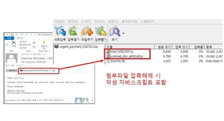 - 1) 지급(payment), 송장(invoice), 계약서(contract) 등 내용의 해외 이메일에 첨부된 파일 실행 금지, 2)메일에 첨부된 압축파일(.zip)에 자바스크립트(.js) 파일 존재 시 실행 금지
