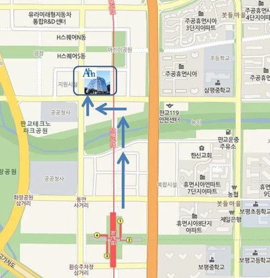 지하철 신분당선 판교역 (1번출구) 도보 7분 소요