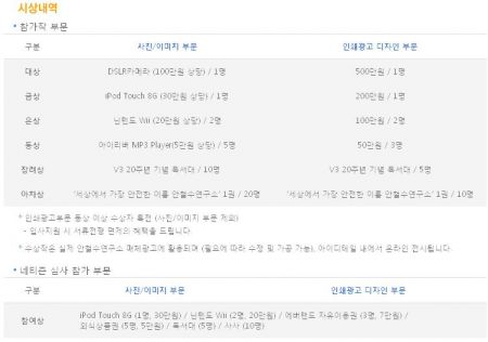 광고는 안철수연구소의 기업 이미지를 나타내거나 종합주치의 개념의 온라인 보안 서비스인 V3 365 클리닉, 소셜 네트워킹 서비스인 아이디테일을 효과적으로 광고할 수 있는 참신한 아이디어를 담은 인쇄용 광고이면 가능합니다.