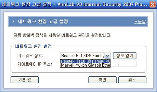 다음과 같이 네트워크 환경 고급 설정 창이 실행되는데 사용할 네트워크 장치(랜 카드가 여러 개일 경우)와 게이트웨이 IP 주소(어떤 네트워크 환경에 접속되었는지 구분하는데 사용)를 지정하면 이러한 조건에 해당하는 경우에 대한 독립적인 정책 설정이 가능해진다.