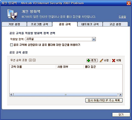 [그림 3] V3 Internet Security 2007의 개인 방화벽 설정 화면
