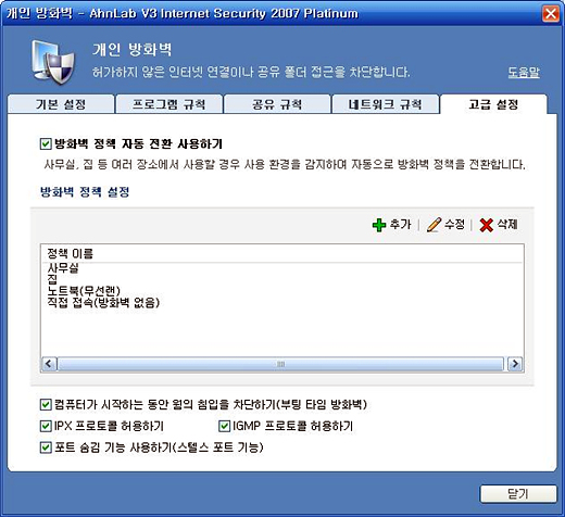 일반적인 방화벽 설정 외에 보다 방화벽 기능을 효과적으로 사용할 수 있도록 해주는 고급 설정 기능을 제공한다.