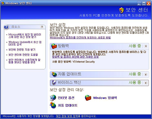 Windows 운영체제에서는 현재 컴퓨터의 보안 상태를 한 눈에 파악할 수 있도록 [보안 센터]라는 기능이 제공된다. 여기서 사용중인 방화벽, 바이러스 백신 프로그램의 상태와 자동 업데이트의 사용 여부를 확인할 수 있다. 지난 호에서 살펴본 것과 같이 기본적으로 Windows 운영체제에서 제공하는 방화벽 프로그램이 사용되지만 보안업체에서 제공하는 프로그램을 설치할 경우 이 기능을 대체한다. 다음 그림에서 방화벽 프로그램으로 V3 Internet Security 2007이 지정되어 설정되어 있음을 확인할 수 있다.