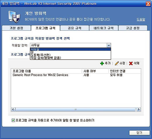 앞서 살펴본 프로그램 규칙, 공유 규칙, 네트워크 규칙을 네트워크 환경에 따라 서로 다른 정책으로 사용할 수 있는 기능을 제공한다. 기본적으로 사무실, 집, 노트북(무선랜), 직접 접속의 4가지 정책이 제공되는데 새로운 정책을 추가하려면 [추가]를 선택하면 된다.