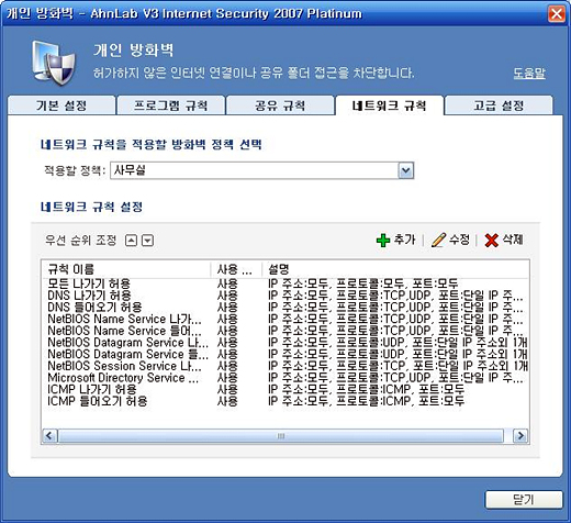 [그림 3] V3 Internet Security 2007의 개인 방화벽 설정 화면
