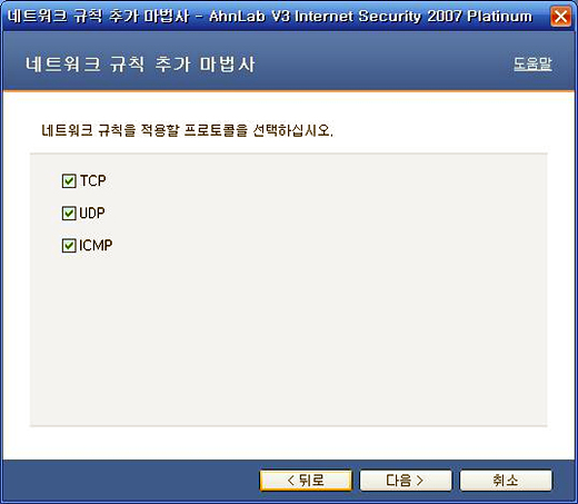 새로운 규칙을 추가하려면 [추가]를 선택한다. 다음과 같이 네트워크 규칙 추가 마법사가 실행되는데 규칙의 대상으로 TCP, UDP, ICMP 프로토콜을 설정할 수 있다. 대상 프로토콜을 선택한 후 특정 포트, 특정 IP에 대하여 세부 규칙을 설정하면 된다. 데이터 교환 시에 허용하거나 차단할 규칙을 적용하는 데에는 들어오는(inbound) 데이터와 나가는(outbound) 데이터에 대해서 구분하여 지정할 수 있다.