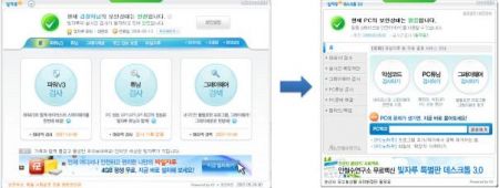 ‘빛자루 데스크톱 3.0’은 우선 화면이 작아졌습니다. 이전 버전과 동일하게 가장 위에는 현재 PC의 보안상태를 알려주고, 문제가 있을 때 쉽게 해결할 수 있도록 하고 있습니다. 중앙에 플래시로 있던 메뉴는 왼편으로 가지런히 정리되어 있으며, 알기 쉬운 기능 명칭으로 변경되었습니다. 가장 기본이 되는 동그라미 3종 검사 세트는 그대로 있어서 바로 실행할 수 있습니다.
