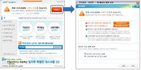 위 두 가지 문제와 상관없이, 바이러스와 스파이웨어의 실시간 감시가 동작하고 있지 않다면 PC는 위험한 상태로 볼 수 있습니다. 이때도 [해결하기] 버튼을 클릭해 바로 실시간 검사 기능을 실행해야 합니다.