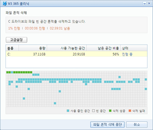 그림4) ‘파일 흔적 삭제’는 디스크 단위로 진행된다. 원하는 디스크를 선택하고, [파일 흔적 삭제] 버튼을 클릭하면 빈 공간(단순 삭제로 지워져 복구가 가능한)을 찾아 덮어씌우기를 시작한다. 디스크 전체를 대상으로 진행하므로 디스크 크기나 사용량에 따라 장시간 걸리는 경우도 있다.