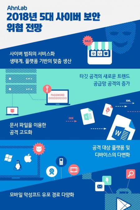 안랩(대표 권치중, www.ahnlab.com)은 2018년에 예상되는 보안 위협을 정리해 ‘2018년 5大 사이버 보안 위협 전망’을 발표했다.