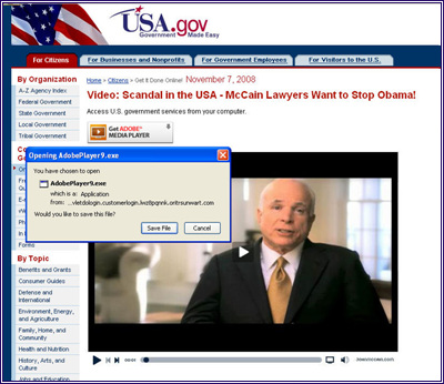 ‘라이텍스(Win-Trojan/Raitex.60928)’라는 이름의 트로이목마는 영문으로 ‘오바마가 대통령 직을 물러날 수 있다’, ‘매케인의 변호사들이 오바마의 탄핵을 추진하고 있다’ 등의 호기심을 자극하는 문구와 함께 거짓으로 제작된 미 정부 공식 웹사이트(2008 USA Government Official Web Site)로 유도를 한다. 위 사이트를 클릭하게 되면, 맥케인 동영상 화면이 표시되는데, 동영상을 보기 위해 어도비플레이어9(AdobePlayer9) 실행파일을 클릭하도록 유도한다.