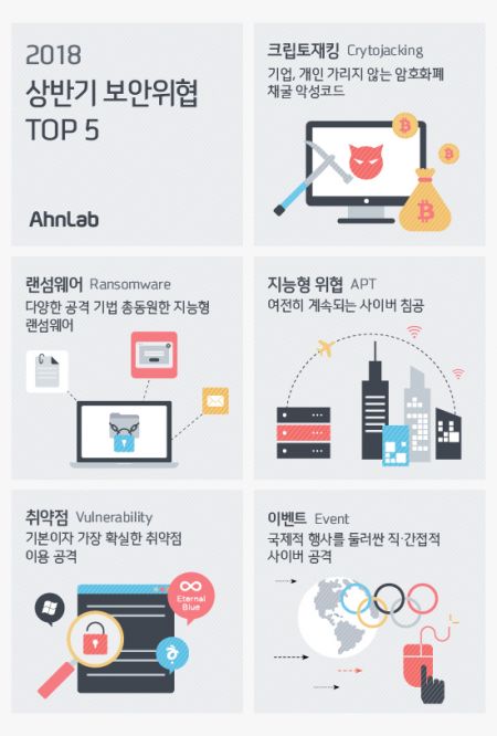 2018년 상반기에는 ▲크립토재킹 공격 대상 확대 ▲랜섬웨어 공격 방식 고도화 ▲지속되는 지능형 위협 공격 ▲취약점을 이용한 공격 지속 ▲특수 이벤트 악용한 사이버 공격 등이 주를 이뤘다.