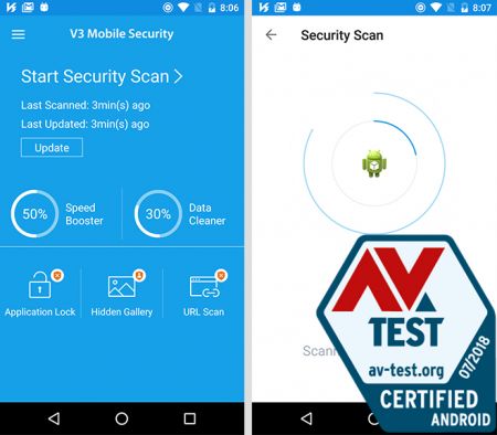 안랩(대표 권치중, www.ahnlab.com)의 안드로이드 스마트폰용 무료 보안 솔루션 ‘V3 모바일 시큐리티(AhnLab V3 Mobile Security, 보충자료 참고)'가 글로벌 보안제품 성능 평가기관 ‘AV-TEST( www.av-test.org)’의 2018년 7월 모바일 보안 제품 테스트에서 종합점수 만점으로 인증을 획득했다.