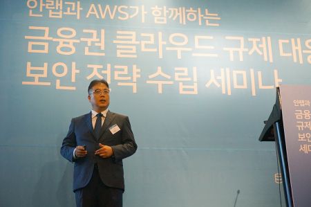 사진설명: 안랩 보안아키텍트팀 박철민 팀장이 ‘한국 금융 기업을 위한 AWS 클라우드 보안 백서 및 활용법’을 발표하고 있다