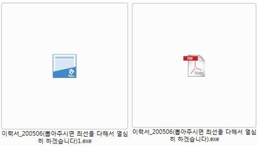 이번 사례는 한 개의 악성코드만 유포하던 기존 사례와 달리 한 개의 이력서 사칭 메일에 정보탈취와 랜섬웨어, 두가지 악성코드를 동시에 포함시킨 것이 특징이다. 공격자가 첨부한 ‘이력서’라는 제목의 압축파일을 실행하면 ‘이력서_200506(뽑아주시면 최선을 다해서 열심히 하겠습니다)’와 ‘이력서_200506(뽑아주시면 최선을 다해서 열심히 하겠습니다)1’이라는 제목의 두가지 파일이 나온다(보충자료 참고). 두 파일은 각각 PDF 파일과 한글 문서파일의 아이콘을 사용해 정상 문서파일로 위장하고 있지만 사실은 모두 악성코드를 포함한 실행파일(.exe)이다.