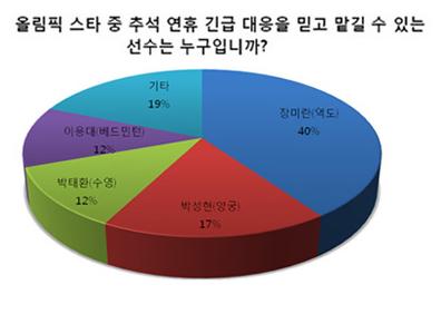 올 추석에도 어김없이 24시간 지속되는 긴급 대응을 믿고 맡길 수 있는 올림픽 스타를 묻는 질문에 응답자의 40%가 장미란 선수를 꼽아 세계 최고 여자 헤라클레스라는 듬직함이 신뢰감을 주는 것으로 나타났습니다. 다음으로 양궁의 박성현 선수가 17%, 수영의 박태환 선수와 배드민턴의 이용대 선수는 각각 12%의 지지를 받았습니다. 기타 의견으로는 여자 핸드볼 골키퍼인 오영란 선수, 유도의 최민호 선수 등이 있었습니다.