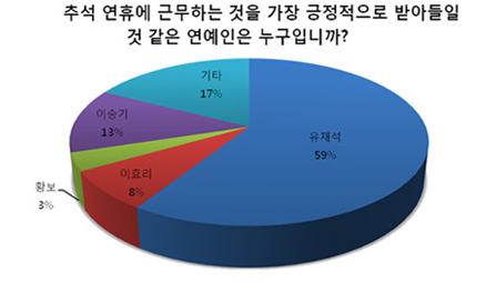 추석 연휴에 근무하는 것을 가장 긍정적으로 받아들일 것 같은 연예인으로는 국민 MC 유재석이59%로 가장 많았고, 다음이 이승기(12%), 이효리(8%), 황보(3%) 순으로 나타났습니다. 기타 의견으로는 ‘16년 동안 칼퇴근만을 해오신 야근 김병만 달인’, 김구라, 박명수, 노홍철 등이 있었습니다.