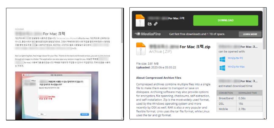 공격자는 먼저 한글로 작성된 피싱 사이트를 제작했다. 사용자가 검색창에 ‘한글 문서 프로그램 for Mac 크랙(*)’, ‘crack Autocad 2006 64 Bit Keygen(**)’ 등의 상용 소프트웨어 불법사용을 위한 키워드를 입력하면 검색 결과 페이지에 해당 피싱 사이트가 노출된다(보충자료1 참고).