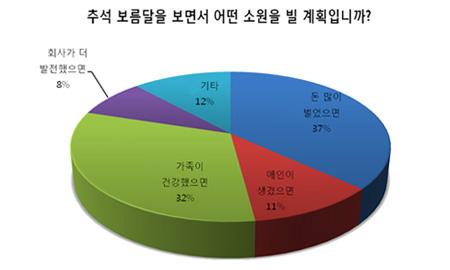 보름달을 보면서 빌고 싶은 소원으로는 ‘돈 많이 벌게 해달라’가 37%, ‘가족의 건강’이 32%로 높게 나타났습니다. 미혼남녀가 많이 근무하는 탓에, ‘애인이 생기게 해달라’도 11%였으며, 로또 당첨, 정국 안정, 세계 평화 등도 있었습니다.