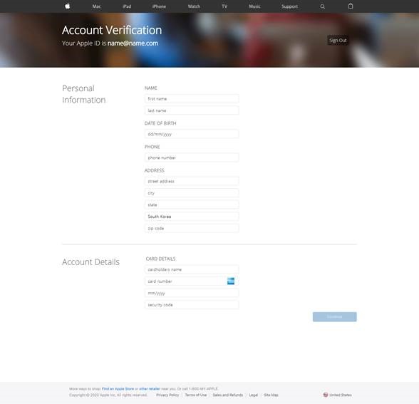 사용자가 피싱 사이트에 자신의 애플 계정정보를 입력하면 ‘이 구매를 취소하시겠습니까(‘Are you sure to cancel this purchase?’)라는 메시지가 노출된다. 사용자가 화면 속 ‘지금 취소하기(Cancel Now)’ 버튼을 누르면 이름, 생년월일, 전화번호 등 개인정보와 신용카드 번호, 유효기간 등 금융정보 입력을 유도하는 페이지가 나타난다(보충자료 2). 사용자가 자신의 정보를 입력하고 ‘계속하기(Continue)’ 버튼을 누를 경우 해당 정보가 공격자에게 전달된다.