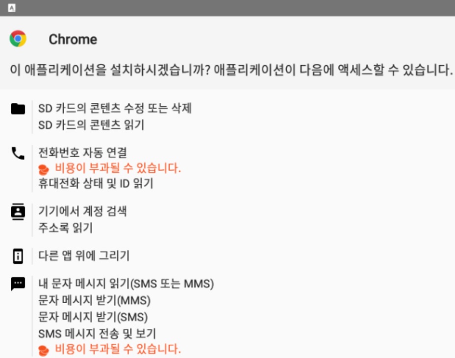 사용자가 무심코 해당 팝업 메시지의 ‘확인’ 버튼을 클릭하면 ‘Chrome’이라는 파일명의 악성 설치파일(.apk)이 다운로드된다. (‘보충자료2. 악성 앱 설치 화면’ 참고). 앱 로고도 정상 크롬 앱과 동일해 사용자는 가짜파일 여부를 판별하기 어렵다.
