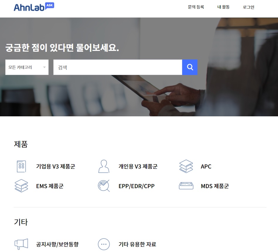 안랩 ASK는 ▲제품군 별 기술문서 및 가이드 ▲제품 관련 자주 묻는 질문(FAQ) ▲공지사항 및 보안동향 정보 등 안랩 제품 사용고객을 위한 전문적인 고객지원정보를 제공한다. 또, △추가 문의가 필요한 고객을 위한 ‘문의 등록’ △내 문의의 진행상황을 확인할 수 있는 ‘내 활동’ 등 사용자 편의를 위한 메뉴도 제공한다.