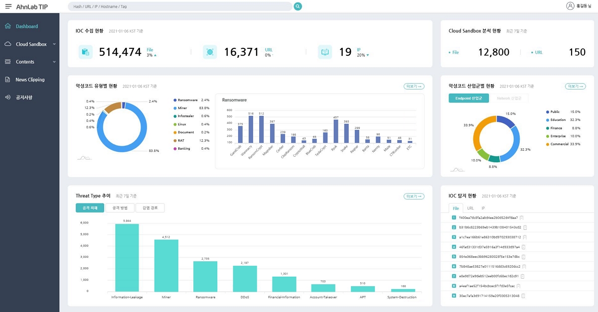 안랩 TIP는 안랩이 강점을 보유하고 있는 국내 보안위협 정보와 최신 글로벌 위협 정보를 수집 및 선별해 조직 보안 담당자에게 유용한 위협 인텔리전스를 제공하는 점이 특징이다. 또, 사용자가 요청한 의심파일의 행위에 대한 분석정보를 제공하며, 단일 대시보드에서 모든 위협침해지표(IoC) 항목을 사용자에게 직관적으로 요약 제공해 이용 편의성도 높였다.