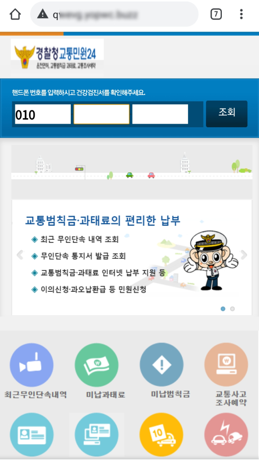 해당 피싱 사이트는 정상 경찰청교통민원24 사이트와는 달리 ‘핸드폰 번호를 입력하라’는 메시지와 입력창을 안내해 사용자의 전화번호 입력을 유도한다. 사용자가 자신의 전화번호를 입력하면 설치 페이지로 이동 후 악성 앱이 다운로드된다.
