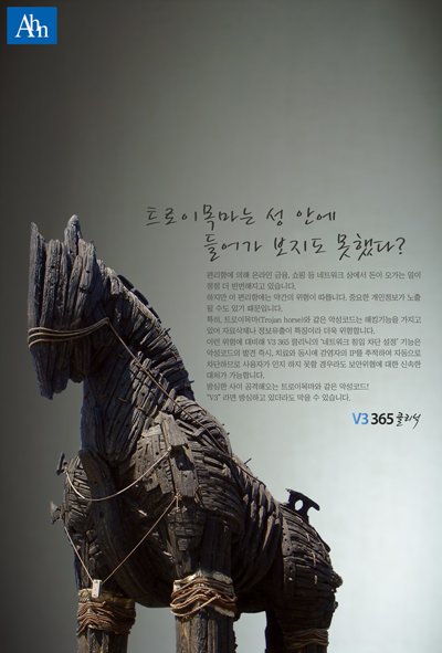 대상작 ‘트로이목마’는 일반인들에게 널리 알려져 있고 가장 피해를 많이 받고 있는 악성코드 중 하나인 ‘트로이목마’를 그리스 로마 신화에 나오는 트로이목마에 빗대어서 표현함으로써 일반 PC사용자들이 방심한 사이에 공격해오는 트로이목마와 같은 악성코드들을 안철수연구소의 ‘V3 365 클리닉’이 모두 차단해준다는 의미를 담고 있습니다.