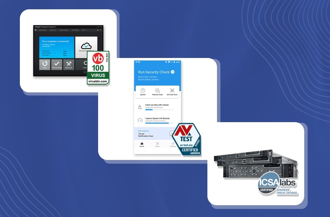 안랩은 올해 ▲엔드포인트 통합 보안관리 솔루션 ‘V3 엔드포인트 시큐리티(AhnLab V3 Endpoint Security) 9.0’이 영국의 글로벌 안티바이러스 평가기관 ‘바이러스 불러틴(Virus Bulletin)’의 ‘2월 VB100’ 평가에서 ▲안드로이드용 무료 보안 솔루션 ‘V3 모바일 시큐리티(AhnLab V3 Mobile Security)’가 독일의 글로벌 보안제품 성능평가 기관 AV-TEST의 모바일 부문 1월 평가에서 ▲샌드박스 기반 지능형 위협 대응 솔루션 ‘안랩 MDS’가 미국 ICSA랩(ICSA Labs)의 1월 ‘지능형 위협 대응’ 평가에서 각각 인증을 획득했다.