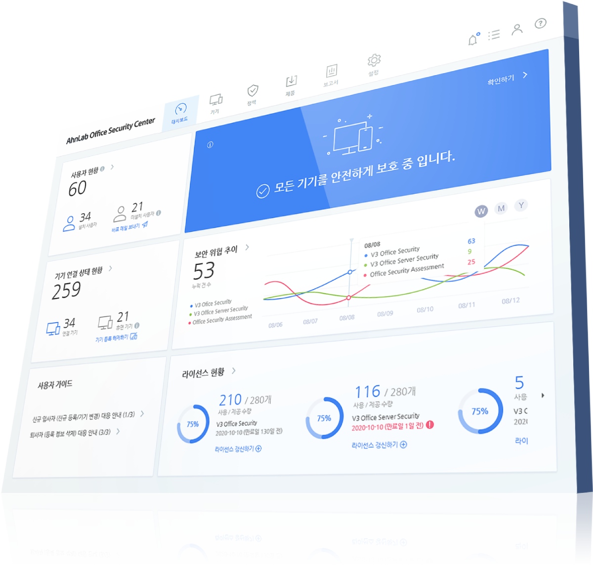‘V3 오피스 시큐리티’는 △윈도우 및 맥OS 신변〮종 악성코드 방어 △유해/피싱 웹사이트 및 네트워크 침입 차단 △사내 PC 최적화 및 관리 등 사내 PC/노트북에 대한 통합 보안관리 기능을 제공한다. ‘V3 오피스 시큐리티’로 각종 악성코드나 네트워크 침입 시도로부터 전사 PC/노트북을 안전하게 보호하고 관리할 수 있다.