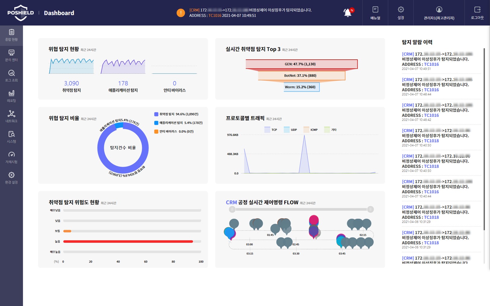 ‘PoShield+A’는 포스코ICT ‘PoShield’의 AI기반 비정상 제어 명령 탐지 기능에 안랩의 OT 환경 보안위협 탐지 기능을 결합한 것이 특징이다. ‘PoShield+A’는 포스코ICT ‘PoShield’의 ▲AI 기반 제어명령 이상징후 탐지 ▲제어명령 송신 상태 및 통계 데이터 제공 기능에 안랩의 △OT망 내부에서 전파되는 악성코드 탐지 △네트워크 취약점 탐지 △어플리케이션 탐지 및 사용현황 모니터링 등 기능을 결합해 안정적인 스마트팩토리 운영을 위한 강력한 보안 기능을 제공한다.
