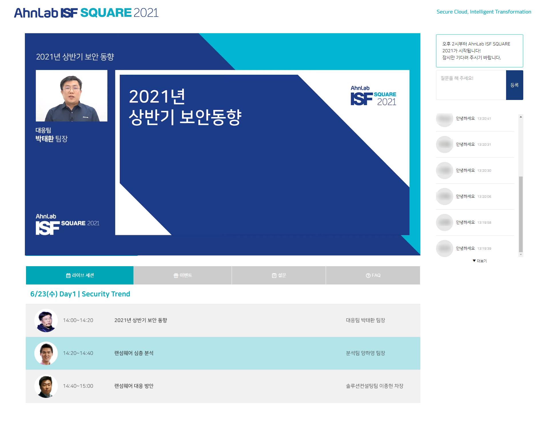 이번 ‘안랩 ISF 스퀘어 2021’에는 공공, 금융을 비롯한 다양한 산업군의 보안 담당자들이 참가했다. 특히 안랩은 발표가 진행되는 동안 웨비나 참가자의 채팅 문의에 실시간으로 전문적인 답변을 제공해 참가자들로부터 호응을 얻었다.