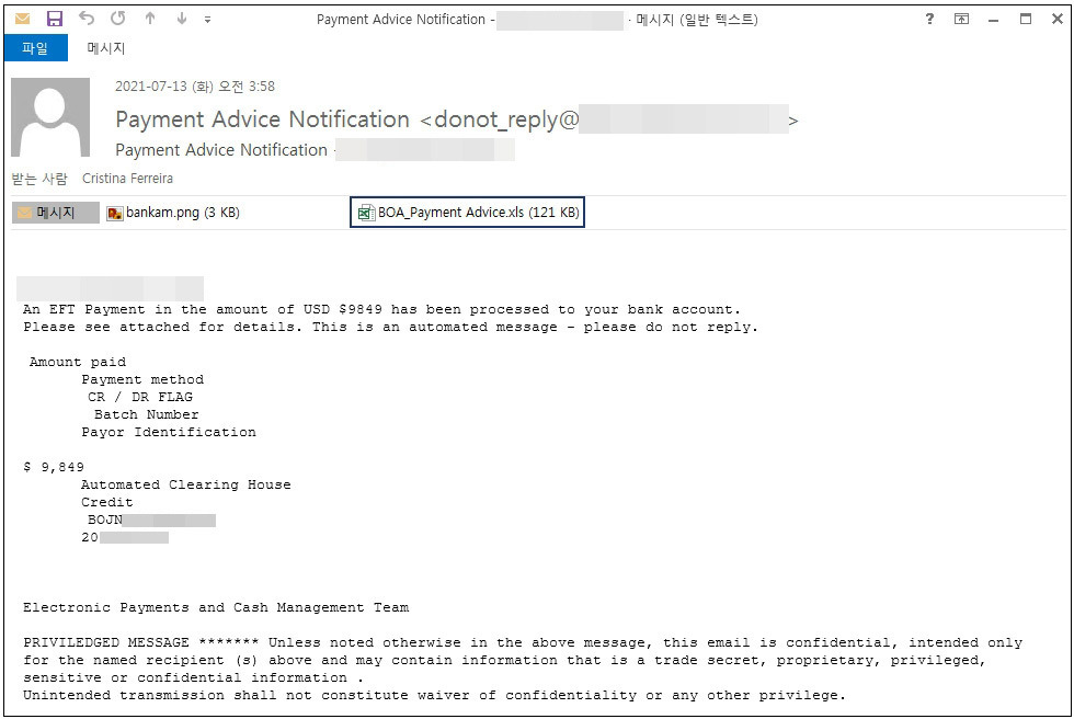 공격자는 BOA의 자동발송 메일로 위장하기 위해 메일 주소에 ‘donot_reply(회신금지)’를 쓰고 BOA의 이름을 사용한 악성 엑셀파일을 첨부했다. 메일 본문에는 “당신의 계좌에 $9849가 전자자금이체(EFT, Electronic Fund Transfer) 방식으로 지급됐다. 자동 발송 메일이니 회신하지 말고 첨부파일을 확인하라”고 기재해 첨부파일 실행을 유도했다(보충자료 1 참조).