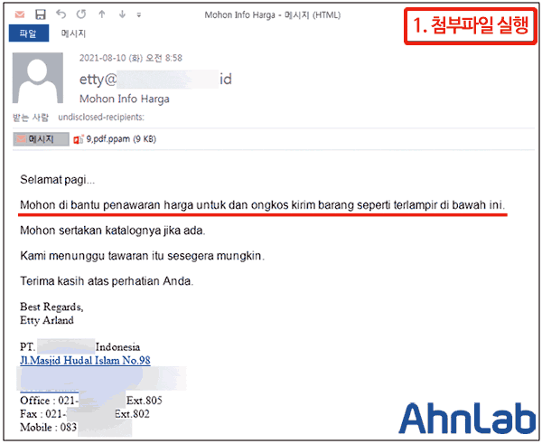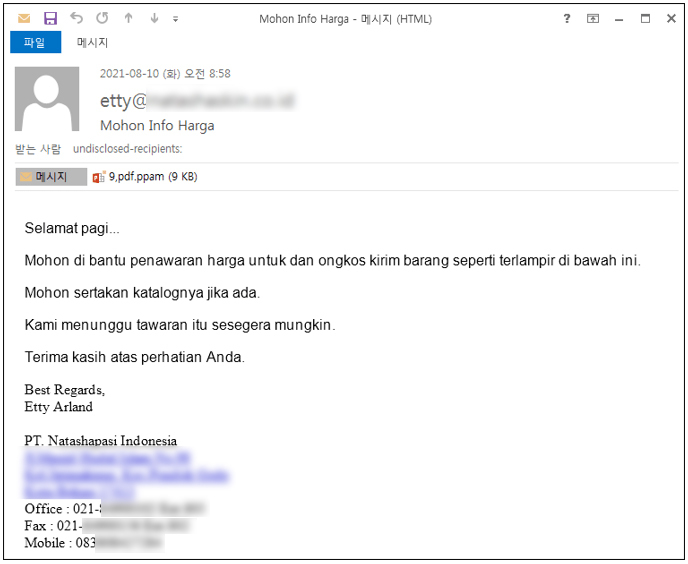 - 인도네시아어로 작성된 메일로 ‘첨부된 상품 및 배송비 견적 확인해달라’며 첨부파일 실행 유도