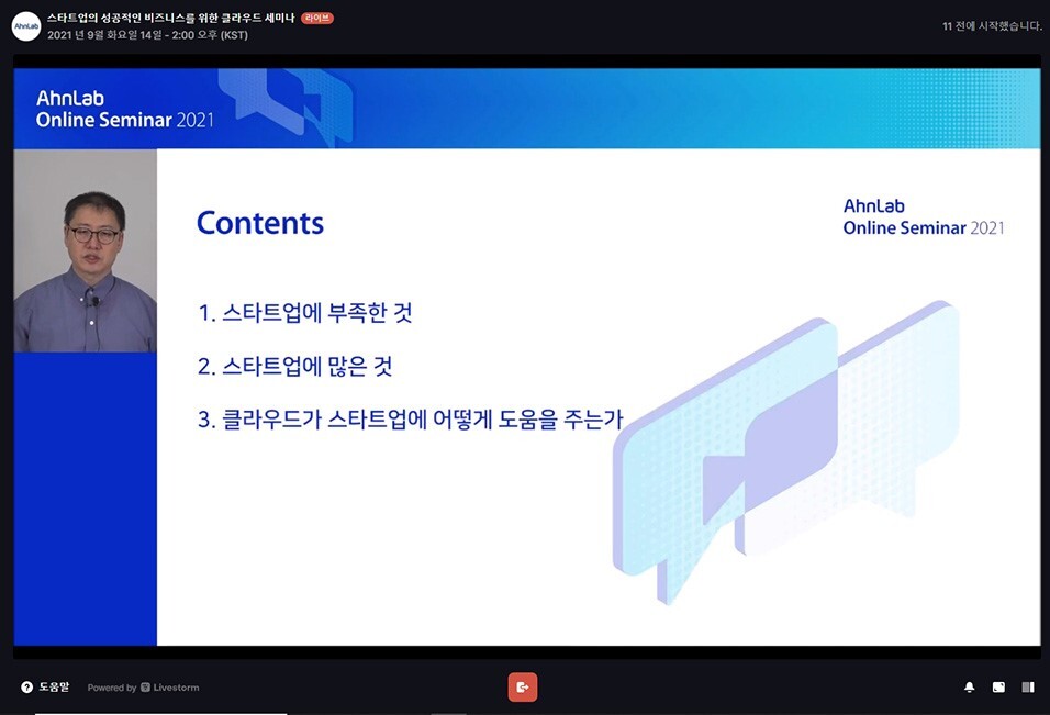 - 실무중심 온라인 강연 ‘안랩 온라인 세미나’의 일환으로 ‘스타트업의 성공적인 비즈니스를 위한 클라우드 세미나’ 개최