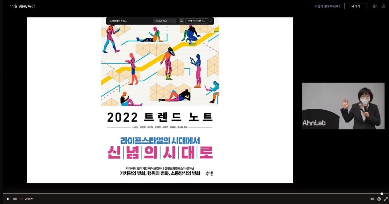 안랩(대표 강석균, www.ahnlab.com )이 4일 임직원 역량 강화 교육 프로그램 ‘VIEW(보충자료 참조)’의 일환으로 '2022 트렌드 노트'의 공동저자 바이브컴퍼니 생활변화관측소 박현영 소장을 초청해 사내 특강을 실시했다.