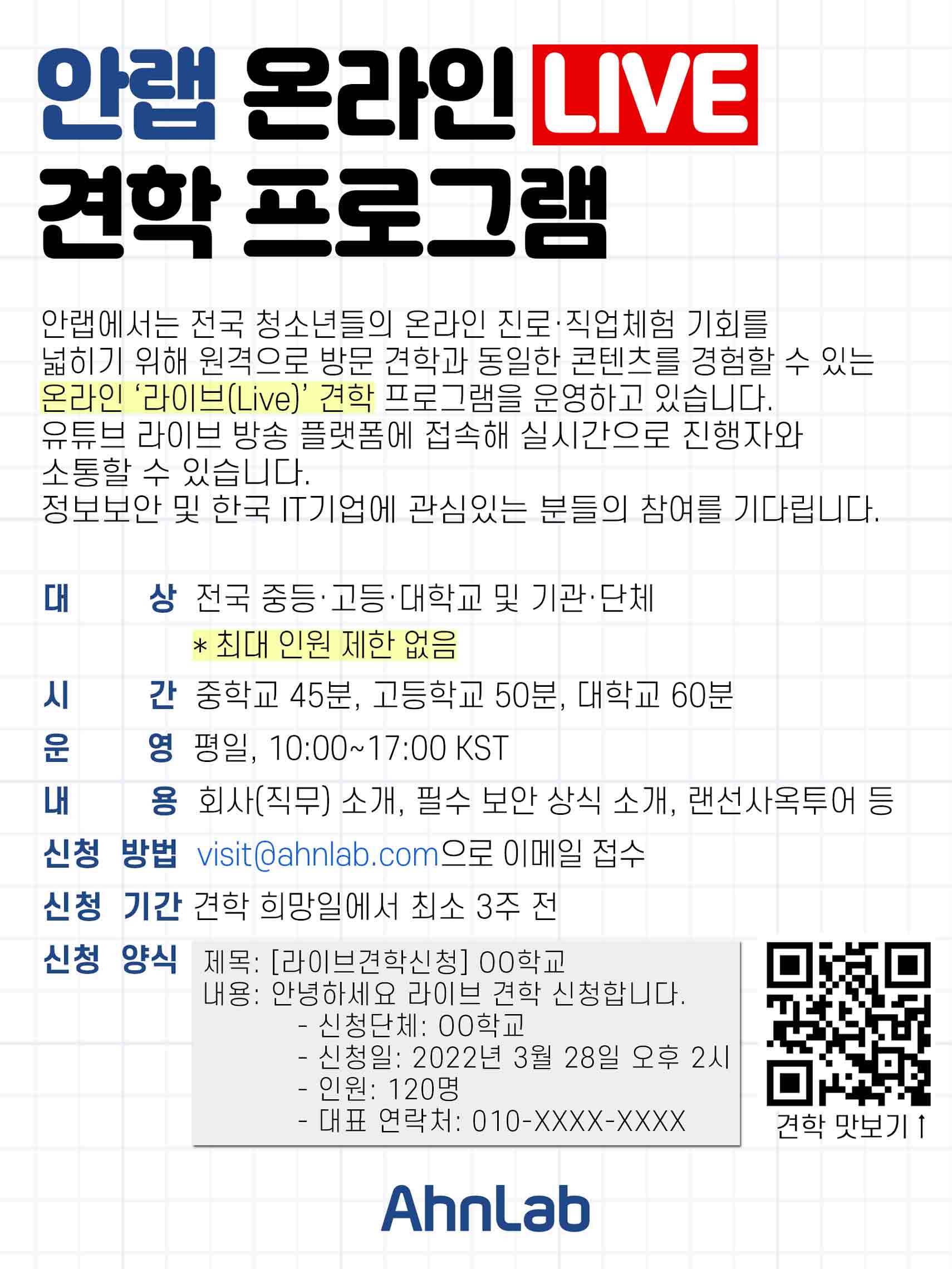 2020년 3월 국내 최초로 시작한 안랩 온라인 ‘라이브(Live)’ 견학은 2020년 3,377명, 2021년 4,275명이 참여하며 계속해서 수요가 증가하고 있다. 중, 고등학교는 최소 100명 이상, 학년 단위 신청을 권장하며 대학교는 최소 30명 이상으로 신청 받고 있다. 도서·벽지 학교의 경우 인원 제한이 없다. 참여를 원하는 학교나 기관·단체는 견학 희망 일자와 참여 인원 수를 기재해 희망일로부터 3주 전까지 이메일(visit@ahnlab.com)로 신청하면 된다.
