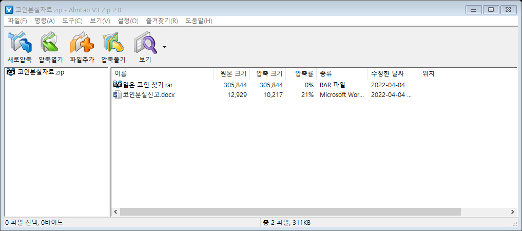 공격자는 메일 등으로 ‘코인분실자료.zip’라는 제목의 압축파일을 유포했다. 압축파일에는 ‘잃은 코인 찾기.rar’라는 압축파일과 ‘코인분실신고.docx’라는 제목의 문서파일 등 2개의 파일이 포함되어 있다(보충자료1 참고).