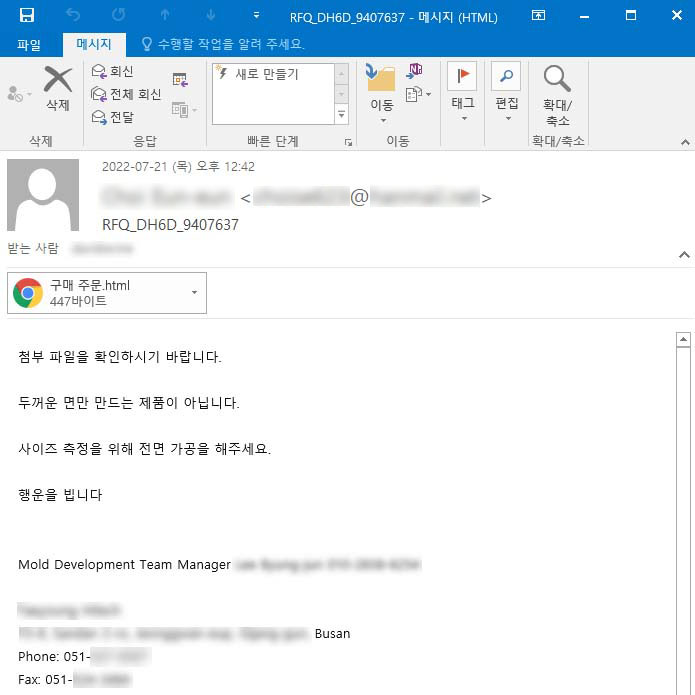 같은 달에 정교하게 제작된 피싱 페이지 연결로 사용자의 계정정보를 노린 피싱 메일도 발견됐다. 공격자는 먼저 특정 제조회사를 사칭한 메일을 보내고, 본문에 제품 제작 관련 요청 내용과 함께 ‘첨부파일을 확인하라’는 문구로 첨부파일 실행을 유도했다(보충자료 3 참조).