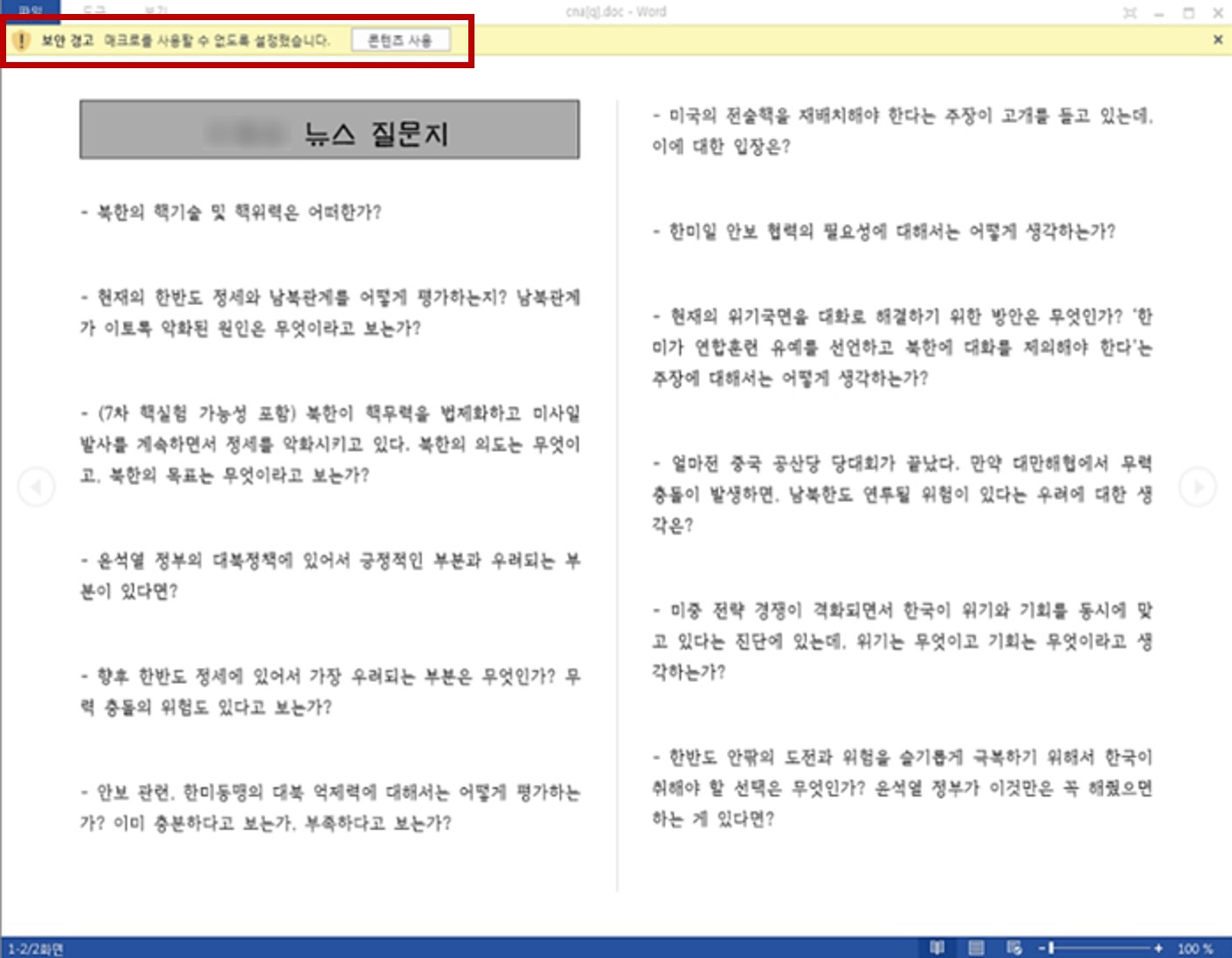 안랩이 발견한 문서는 ‘CNA[Q].doc’라는 파일명으로 정부의 외교와 안보 정책 등에 대한 질문을 포함하고 있다(보충자료1 참조). 만약 사용자가 답변 작성을 위해 타이핑을 시작하면 매크로 사용을 유도하는 메시지와 ‘콘텐츠 사용’ 버튼이 문서 상단에 나타난다. 사용자가 무심코 ‘콘텐츠 사용’ 버튼을 누르면 악성 매크로가 실행되어 사용자 PC의 최근 폴더 경로 및 폴더 내용, 시스템 정보 등이 공격자의 서버로 유출된다.