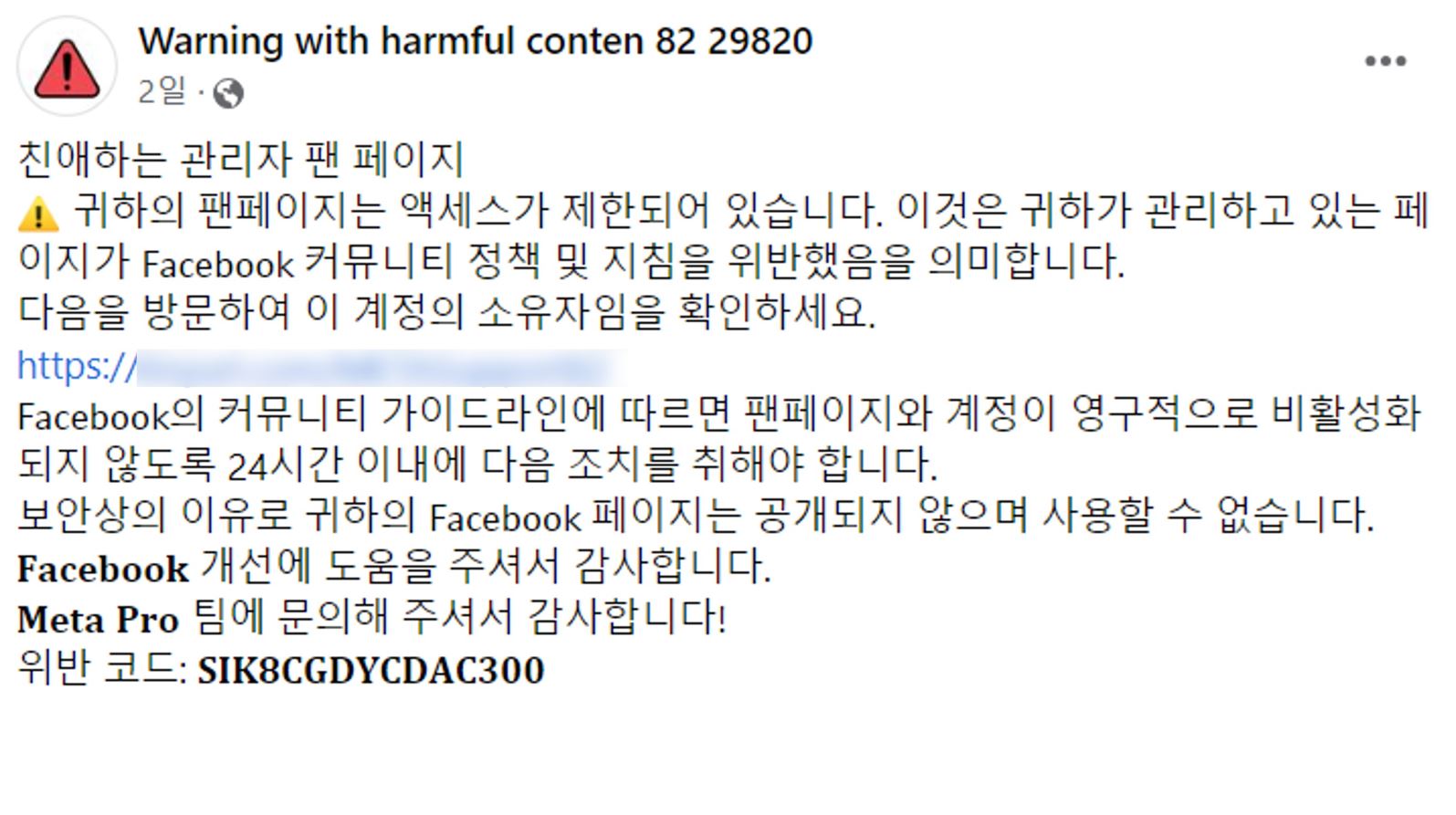 [보충자료 2] ‘귀하가 관리하고 있는 페이지가 Facebook 커뮤니티 정책 및 지침을 위반’해 ‘페이지의 엑세스가 제한’되었다는 내용의 게시글