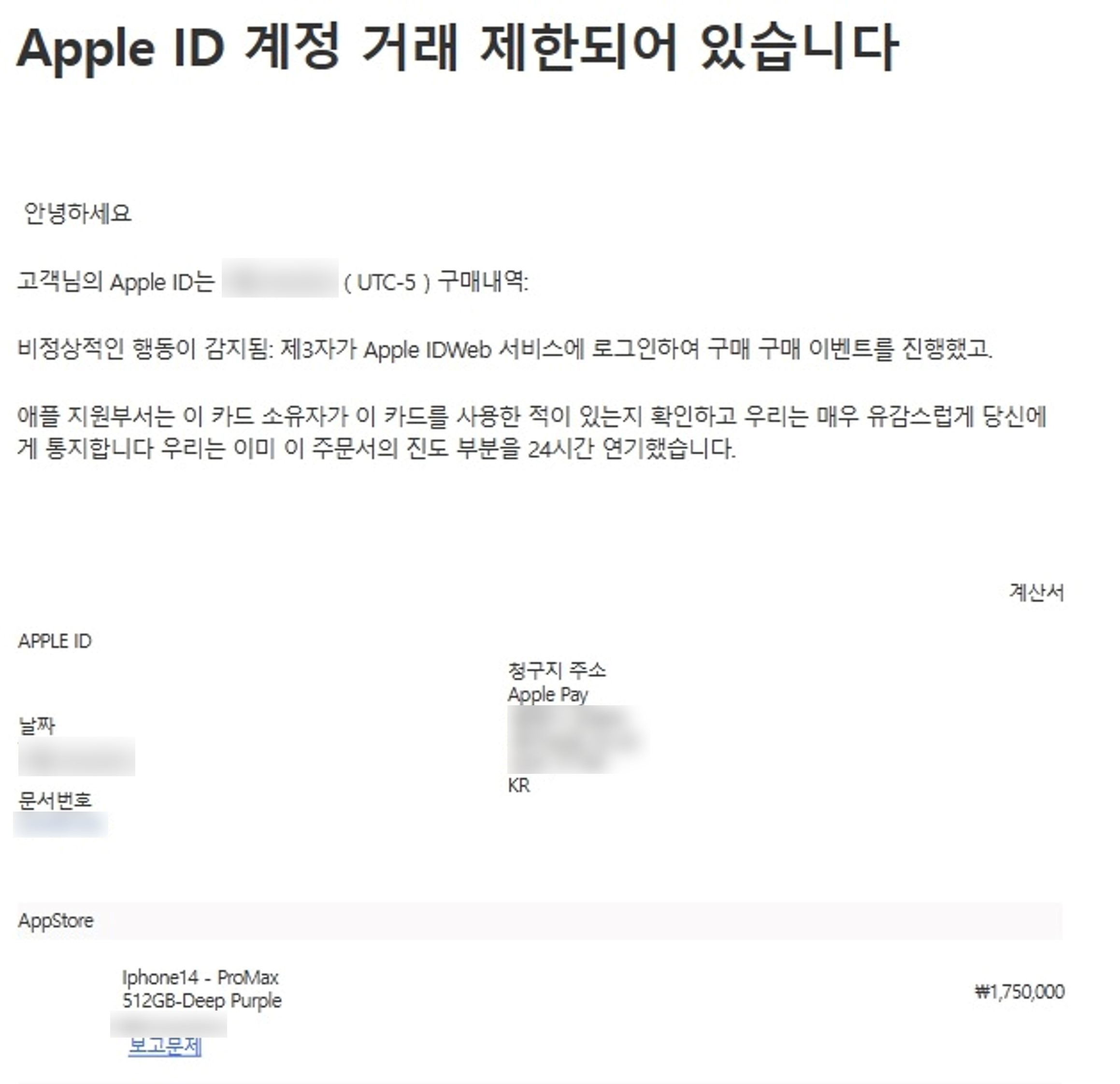 애플(Apple) 지원팀을 사칭해 계정 정보 탈취를 시도하는 사례도 꾸준히 발견되고 있다. 공격자는 메일 발신자명을 ‘AppleSupport Team’으로 써서 정상 메일인 것처럼 위장했다. 그러나 주소를 자세히 보면 주소의 도메인 부분이 애플 공식 도메인인 ‘애플 닷컴(apple.com)’이 아닌 다른 도메인을 사용하고 있다(예시: hotmail.com 등). 메일에는 “누군가가 사용자의 애플 계정으로 결제했으니, 본인이 구매한 것이 아니라면 지원 부서에 문의하라”며 ‘애플 지원 액세스’ 링크를 삽입했다. 사용자가 무심코 해당 아이콘을 누르면 애플의 공식 웹사이트처럼 교묘하게 위장한 계정탈취 목적의 피싱 사이트로 접속된다.
