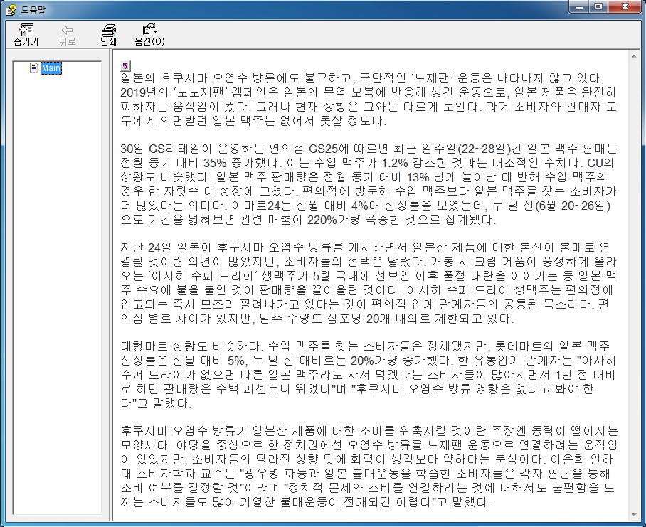 공격자는 먼저 ‘project.chm’이라는 이름의 윈도우 도움말 파일(.chm)을 유포했다. 유포에는 오염수 처리와 관련한 내용을 담은 이메일 등을 이용했을 것으로 추정된다. 사용자가 무심코 해당 파일을 실행하면 ‘후쿠시마 오염수 방류’와 ‘노재팬’ 캠페인과 관련한 현황을 담은 기사 내용이 나타난다(보충자료 참조).